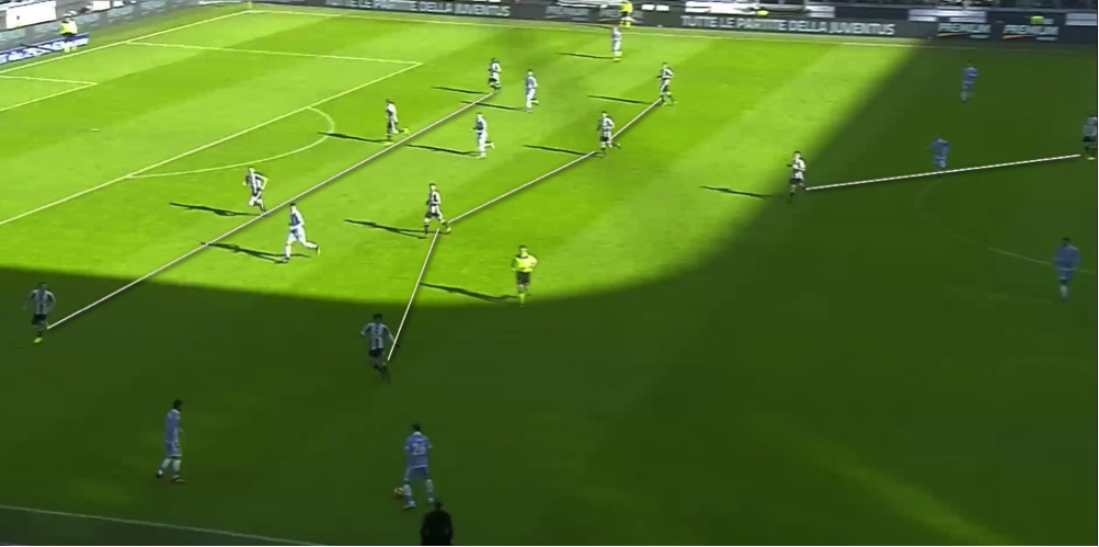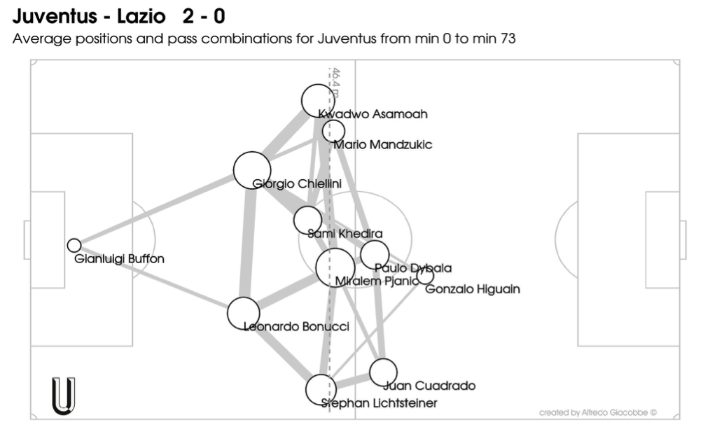 パスの構成もまた従来とは異なっている。ショートパスの比率はシーズン平均の84.3%を大きく上回る87.7%に達した。パス成功率が高まったのはその必然的な結果である。ユベントスは、高いテクニックを持つ選手たちを数多くピッチに送り出すと同時に、組み立ての幅と2ライン間のプレーを保証する陣形を敷くことを通し、ボールを保持することによって守るというアプローチを選んだ。