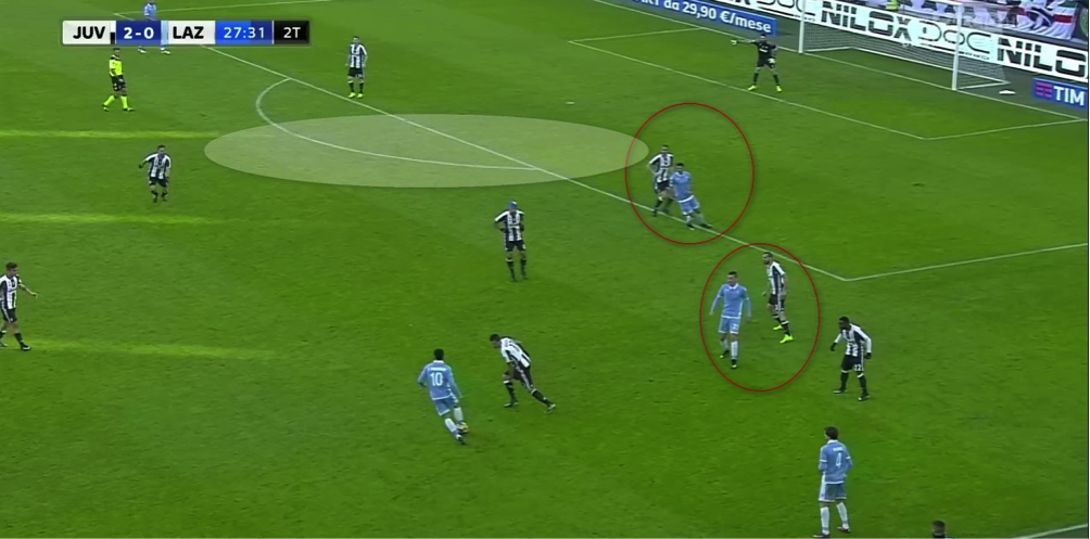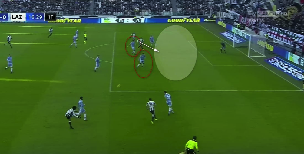 17分に決まったイグアインによるユベントスの2点目は、右サイドをワイドに使った組み立てから、ラツィオの2CBの信じられないポジショニングミスによってもたらされた(上図参照)。