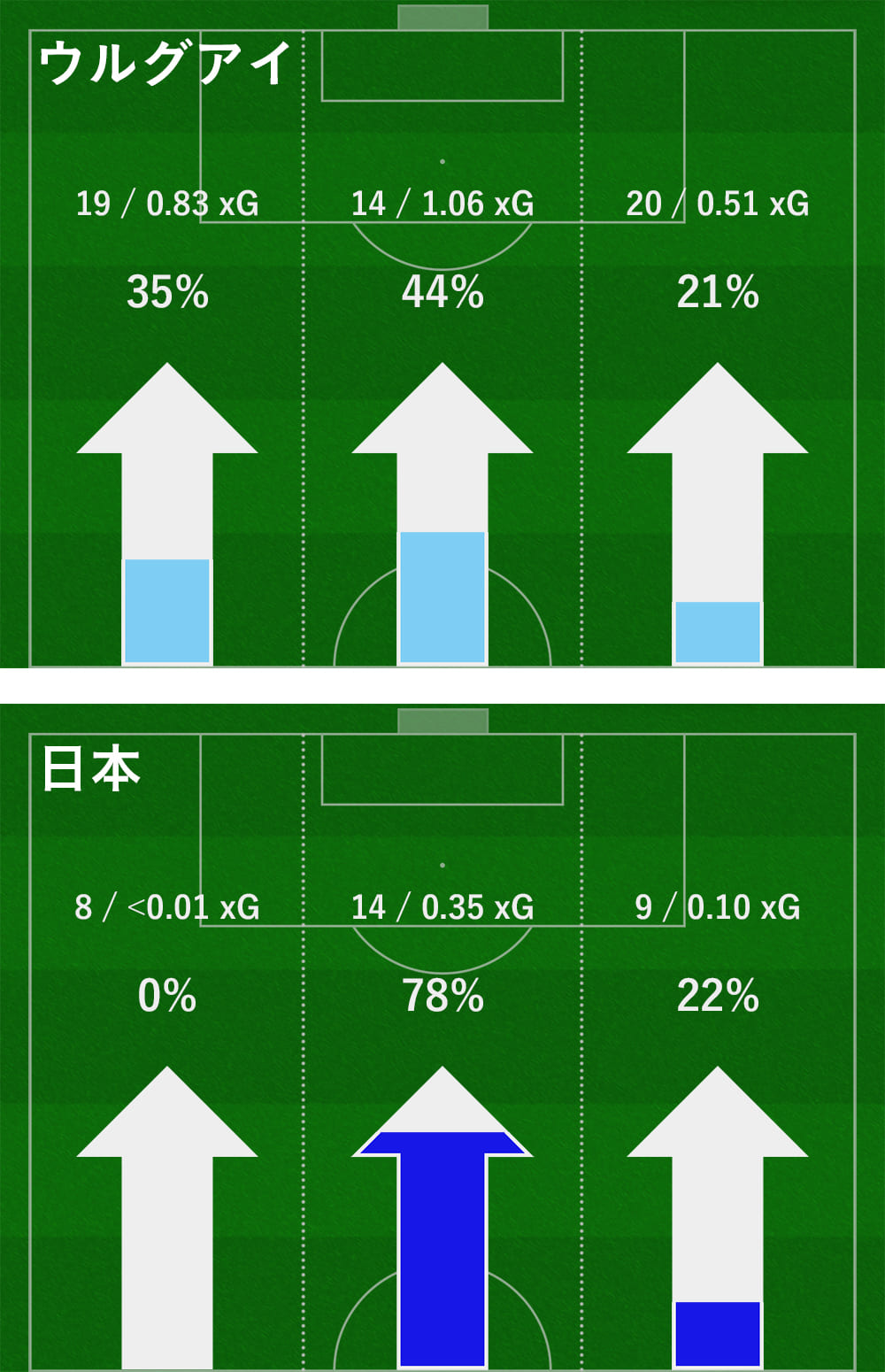 このデータはピッチを縦に3分割し、どのサイドでより攻撃が行われたか、そしてどのサイドの攻撃が1番脅威だったかを示すものである。ウルグアイの攻撃はサイドからが多かったのに対し、日本はサイドよりも中央を使い攻撃していたことがわかる。さらに中央突破によるxGはサイド攻撃より高く、効果的に行えていたことが示されている。それではなぜ、人が密集しやすくボールを持つのが最も困難な中央で数的優位を得ることができたのか。それはまさに、サイドMFが中でプレーしていたことに起因している。
