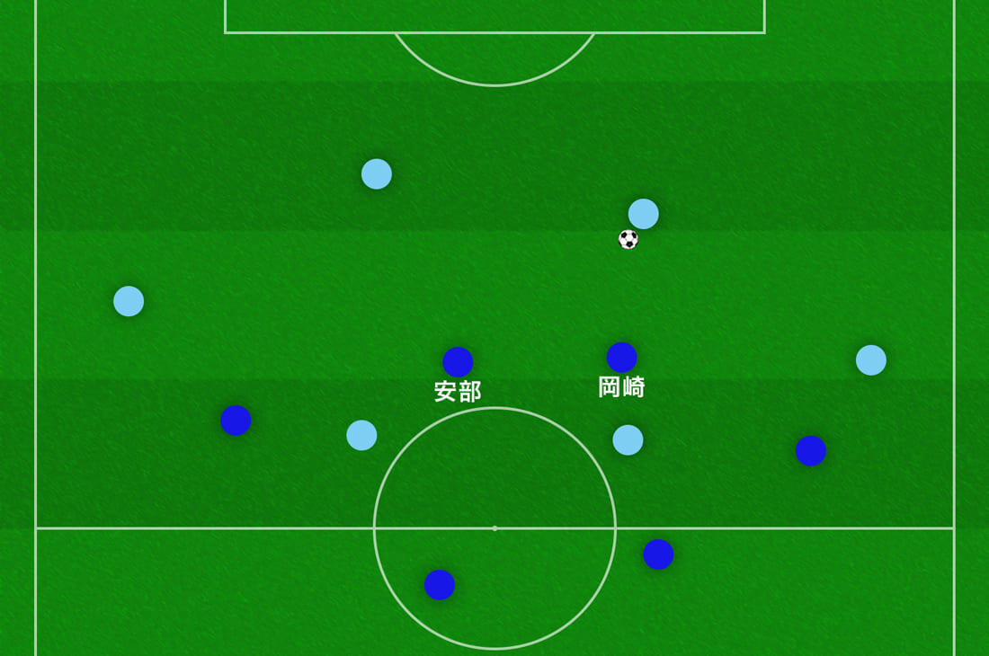 今回は、あえてFW、MF、DFの各ユニットごとにタスクとパフォーマンスを分析してみた。初めに、岡崎と安部裕葵のFWユニットから。相手CBがボールを持っている時は、守備的MFのトレイラとベンタンクールを警戒しながらプレスへ行っていた。ただし、相手のビルドアップ陣形が整っている時はそこまで激しく行かない。プレスの開始位置に関しては、前のチリ戦のような前からの無駄追いは減少。計画的に後ろのMFラインとの距離をコンパクトに保ちながら、センターサークルのあたりからスタートしていた。ウルグアイの2セントラルMFは日本のCFによってパスコースを消されているので、SBの位置に下りたり、たまにCBの間に入ったりと臨機応変に工夫したポジショニングを見せていたが、先のデータでも示したように、結局はCBが前に蹴る場面が多かったように感じる。