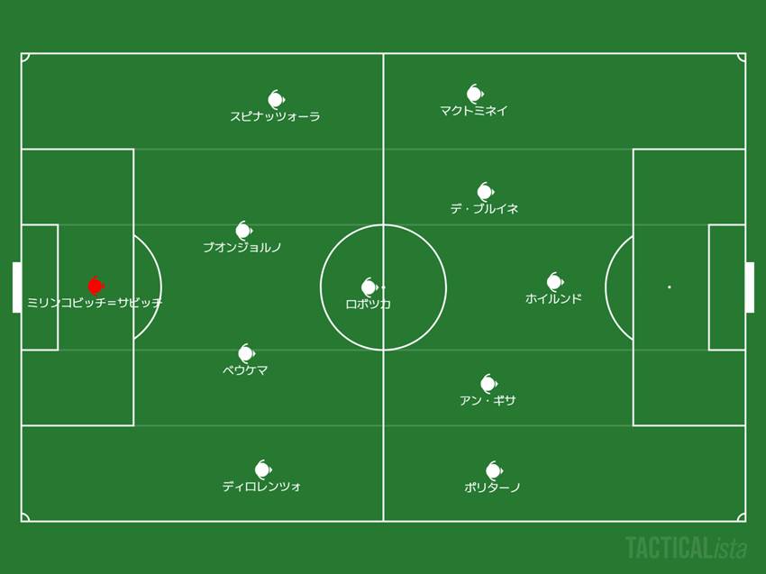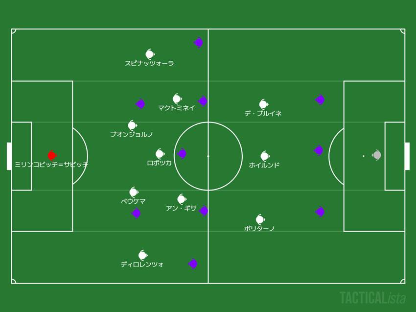 攻撃はポリターノが右サイドに張って、そこからゴリゴリとカットインを仕掛けます。左はSBスピナッツォーラが幅を取り、デ・ブルイネはハーフスペース起点に動く。マクトミネイはかなり広範囲に自由な動き方でした。右側は固定的、左側が流動的、遊軍マクトミネイ。