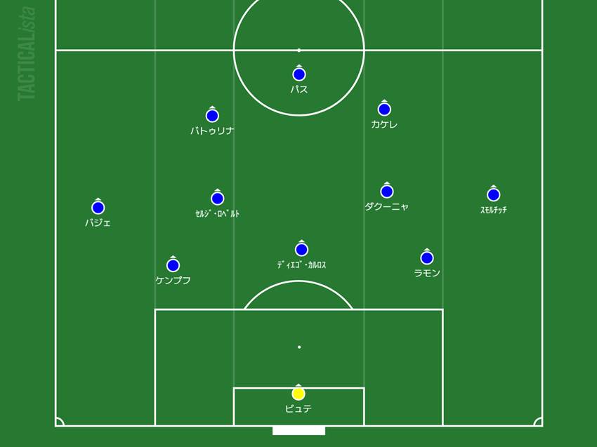 基本的には[4-2-3-1]システムのコモですが、ローマとの大一番では[3-4-2-1]でした(下図)。