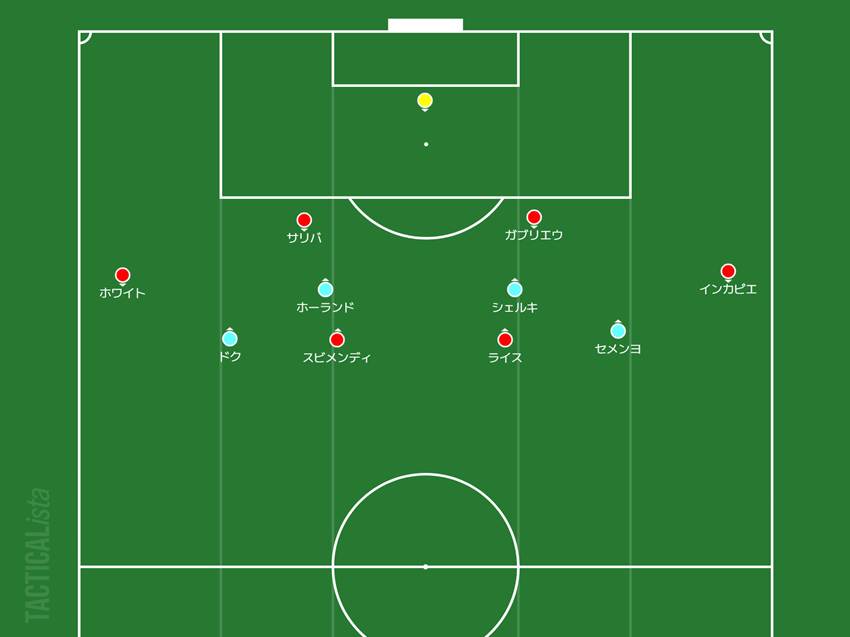 ドク、ホーランド、シェルキ、セメンヨのラインをアーセナルは越えられなかったですね。この4人の壁の背後にライス、スビメンディのボランチ2人がフリーで待機しているのですがそこへつなげない。