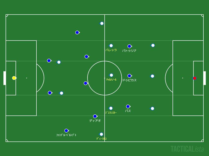 ちょっと特殊だったのがディアオのポジショニング。ディ・マルコをマークしながら、途中で右SBファンデル・ベルンプトに受け渡していました。基本的にマンツーマンなのですが、ここだけ曖昧な感じ。というのも、インテルが早々にMFが下がってきて配置を変化させていたからです(下図)。