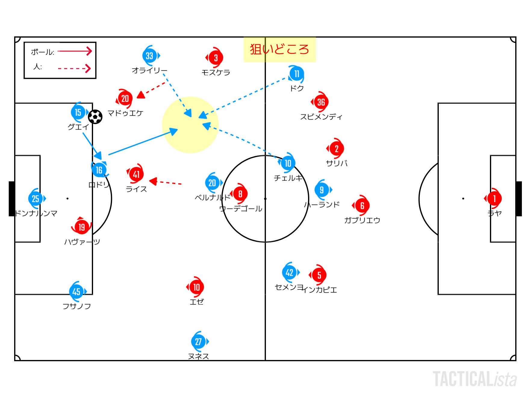 誘導する左サイドに乗っかるケースもある。CBグエイ、SBオライリーなどが低い位置からボールを持ちつつ、相手のプレスを自陣側に誘導。特に狙い目にしたのは右ボランチのスビメンディ周辺で、右ウイングのマドゥエケや、トップ下のウーデゴールを手前に引き出しながら、左ウイングのドクやオライリーが左のハーフスペースに入ることで、アーセナルのプレスの切れ目を作っていった(下図)。
