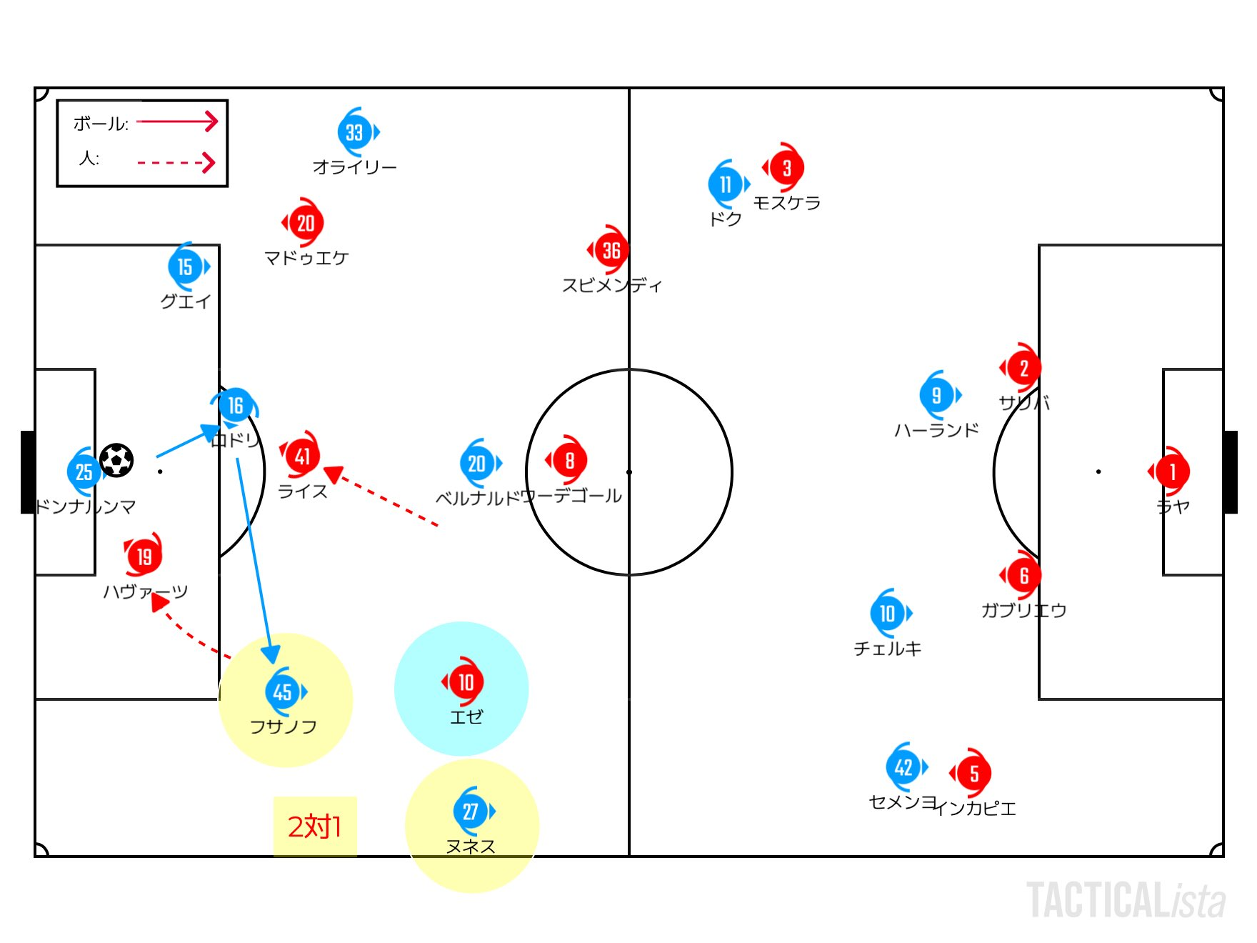 シティにとって一番効果的なのは、そのハヴァーツの背中を使える形。右CBフサノフまでパスをつなぐことができれば、左ウイングのエゼは右SBヌネスとの挟み撃ちにされる格好となる。早々に右サイドから前進したように、シティはボランチにボールを一度当てながらハヴァーツの背中にボールを送っていった(下図)。