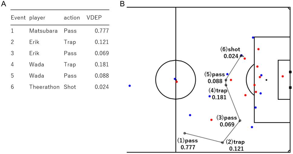 守備の状態を評価する手法[3]により、攻撃側のイベント系列(パス、トラップ、シュートなど)に対して、各アクションの価値を数値として割り当てる例。左はイベントごとのスコア、右は同じ連続プレーをピッチ上に重ねて、どの判断が価値を増減させたかを直感的に示している