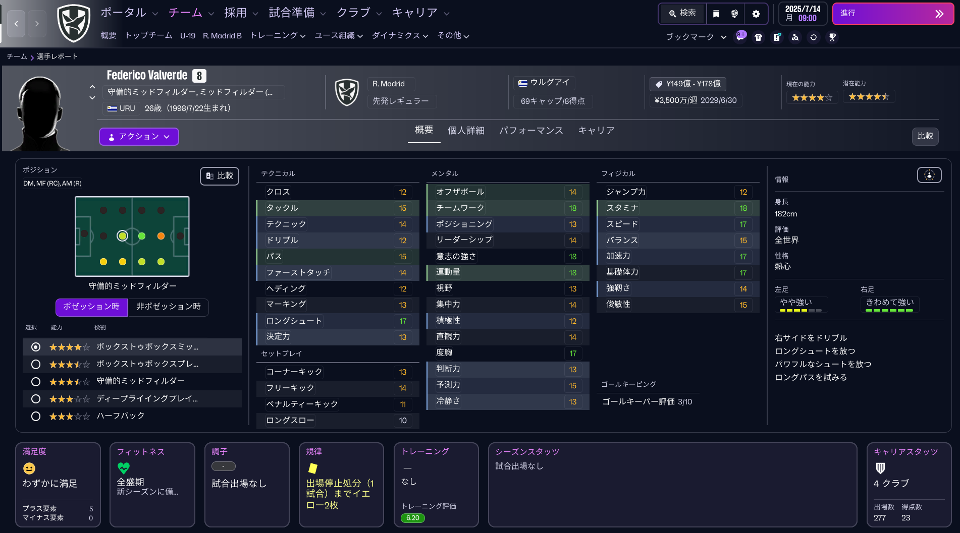 バルベルデはチームワーク、意志の強さで「18」という最高に近い評価。運動量とスタミナも「18」で、チームのために献身的にプレーするスタイルが浮き彫りにされている。