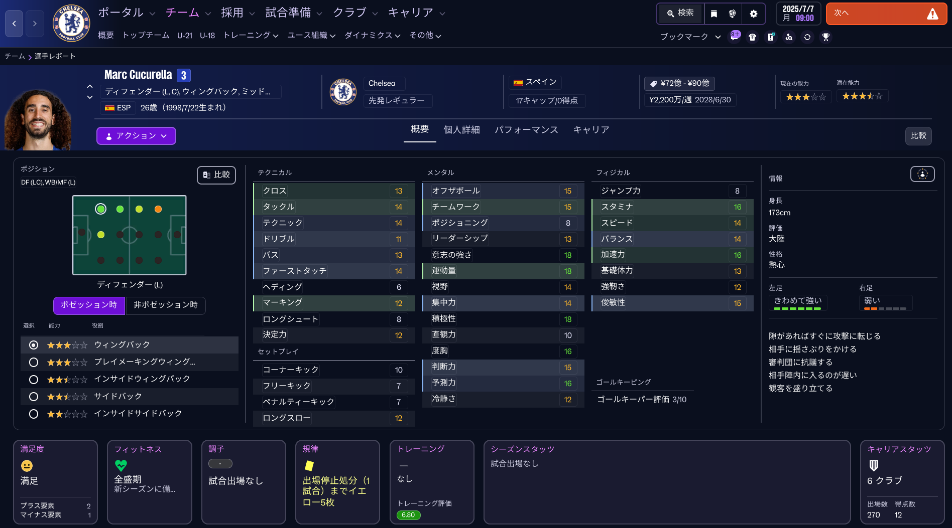 一方、典型的な左SBであるマルク・ククレジャの場合、意志の強さと運動量、積極性というメンタル面での数値が「18」と非常に高く、加速力も「16」でフィジカル面も数値が高いが、テクニカル面ではソボスライ、バルベルデに及ばない。ただ、従来のSBに求められる資質としては十分で、世界最高クラスといっても過言ではないだろう。
