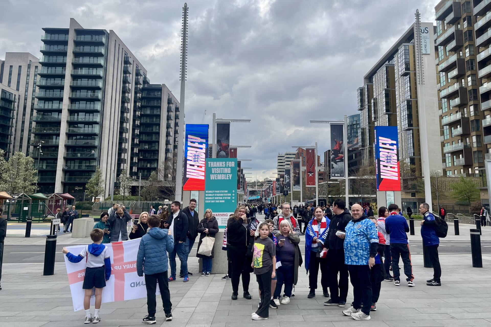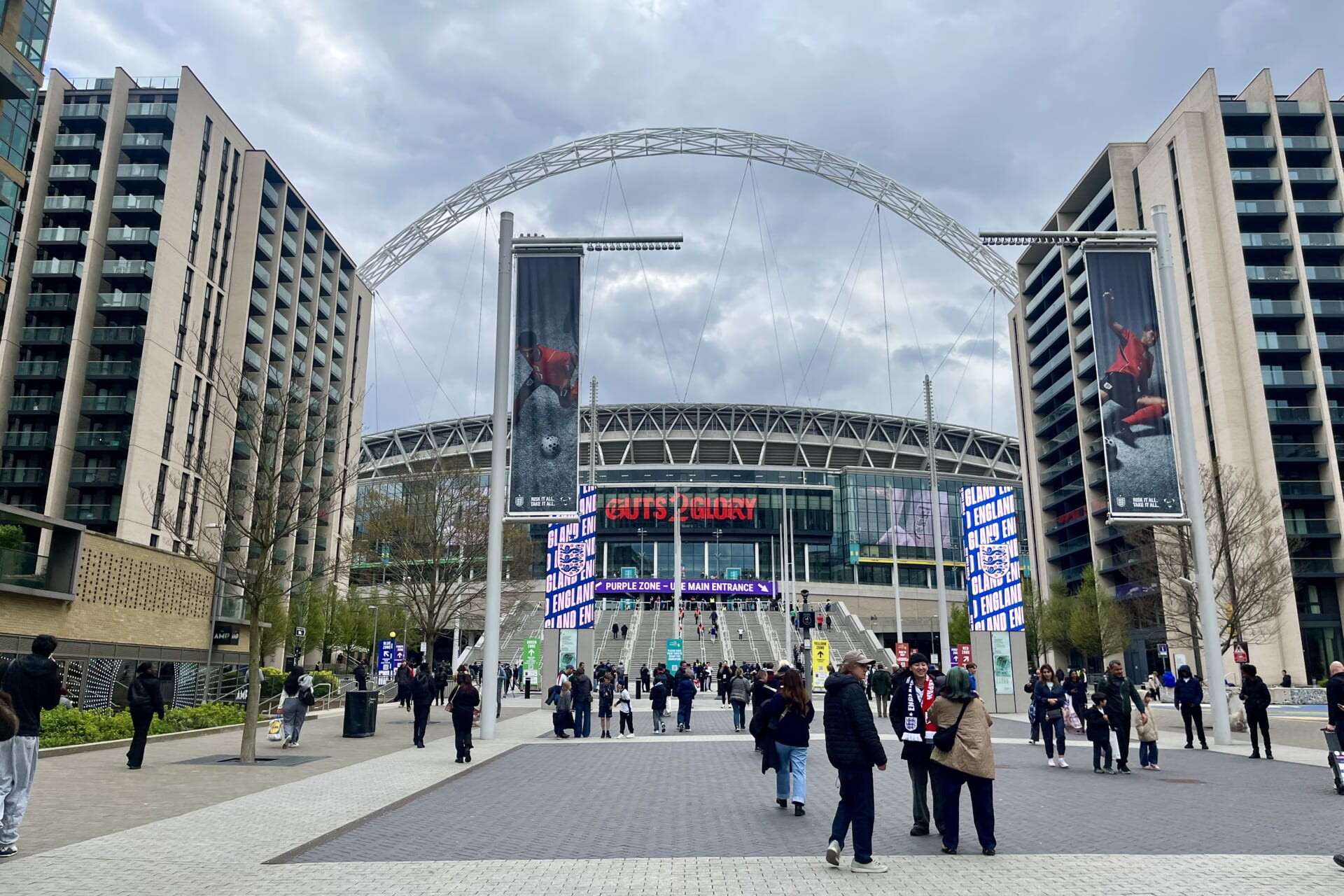 開発が進んで周囲にマンションが増えたスタジアムの正面通り。奥に見えるのが夜はライトアップされるウェンブリーの象徴的なアーチ(Photo: Yukiko Ogawa)